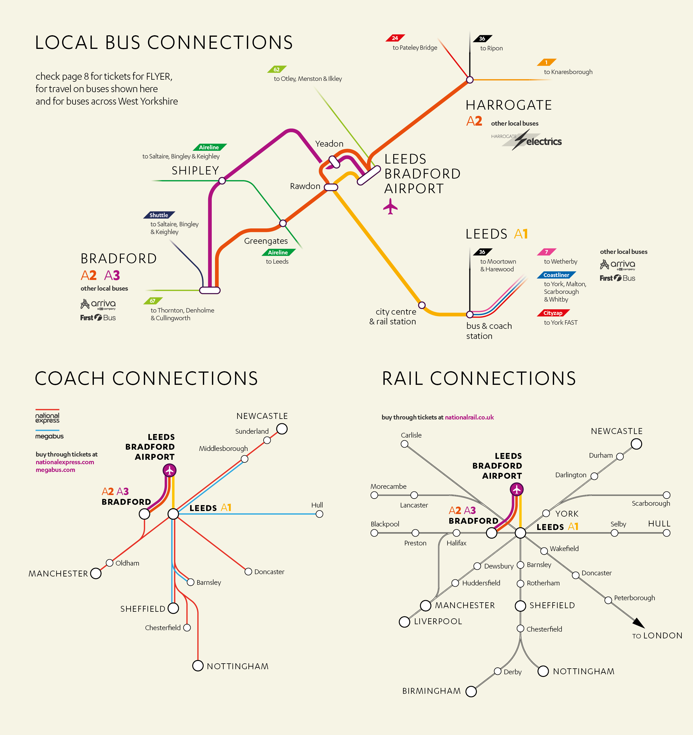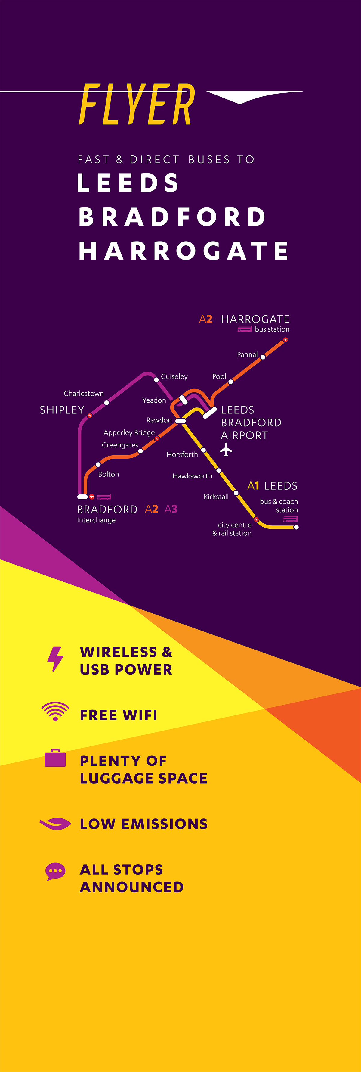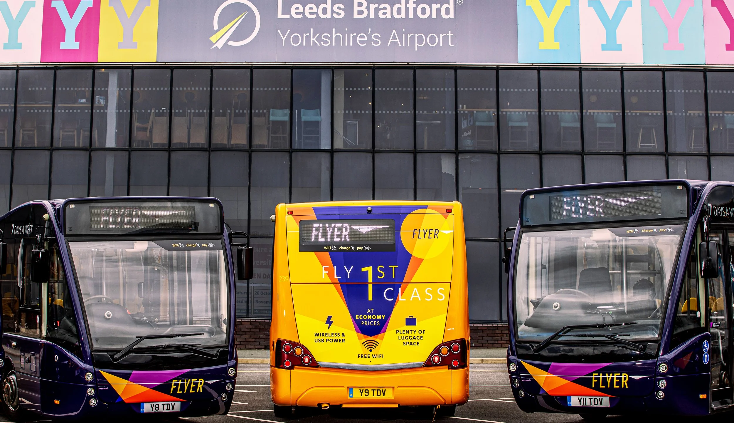 The bus station at Leeds Bradford Airport is the main focus of attention, both to signify where the buses go, and to introduce the service as an attractively priced, sustainable alternative to taxis and car hire.