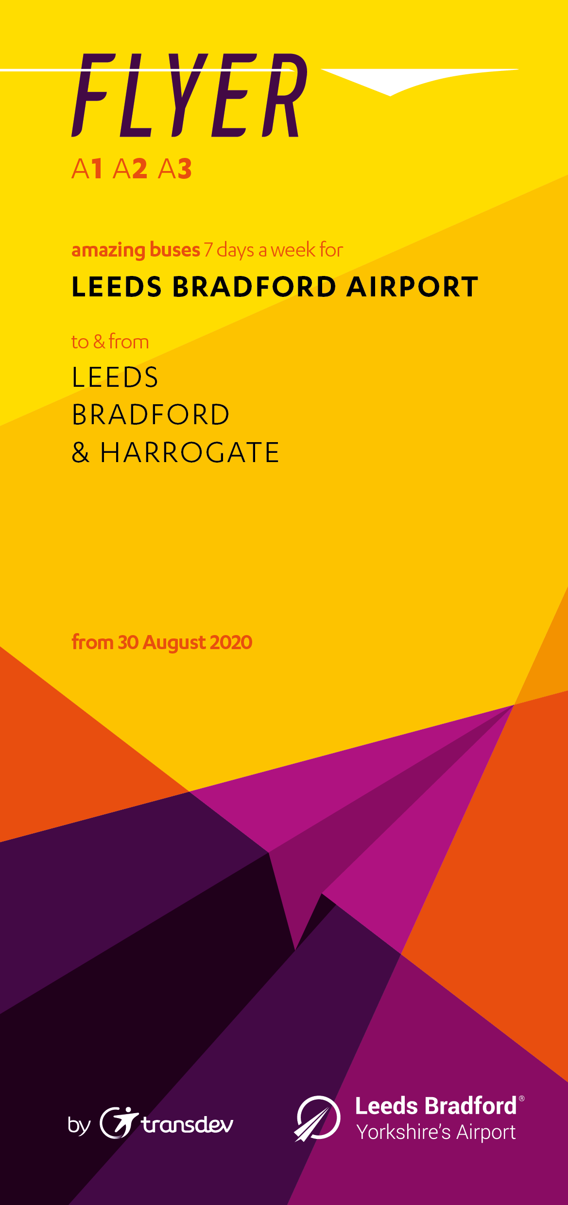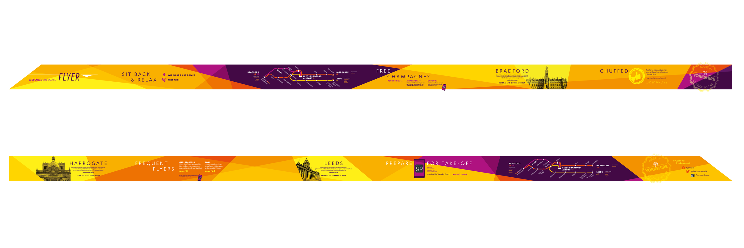When Transdev took over the public transport connections to Leeds Bradford Airport, I was asked to adapt the brand I had designed for the buses to various sites at the airport and in the cities served, in order to help people quickly realise there was a modern, viable and sustainable way to get to/from the terminal directly.