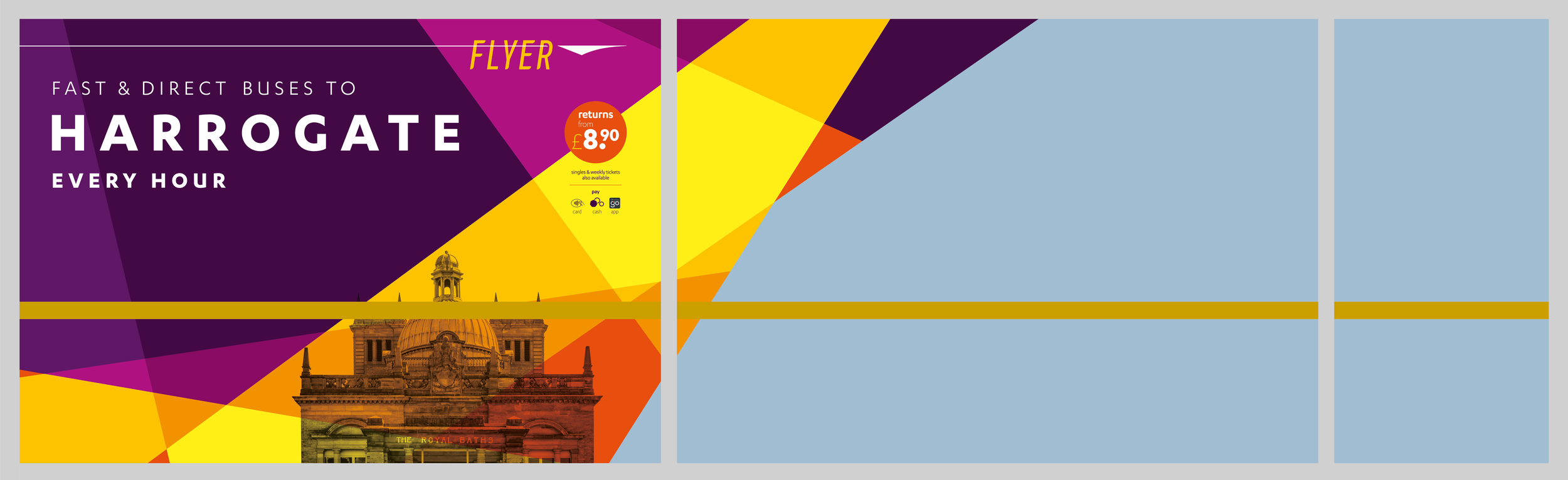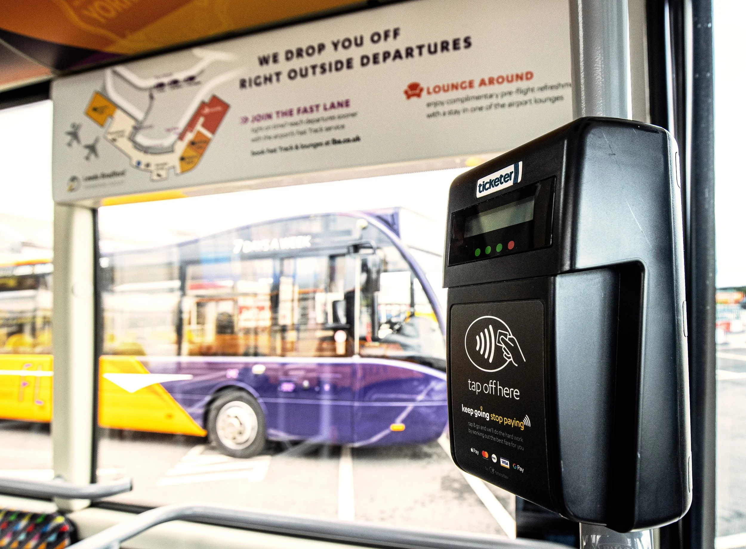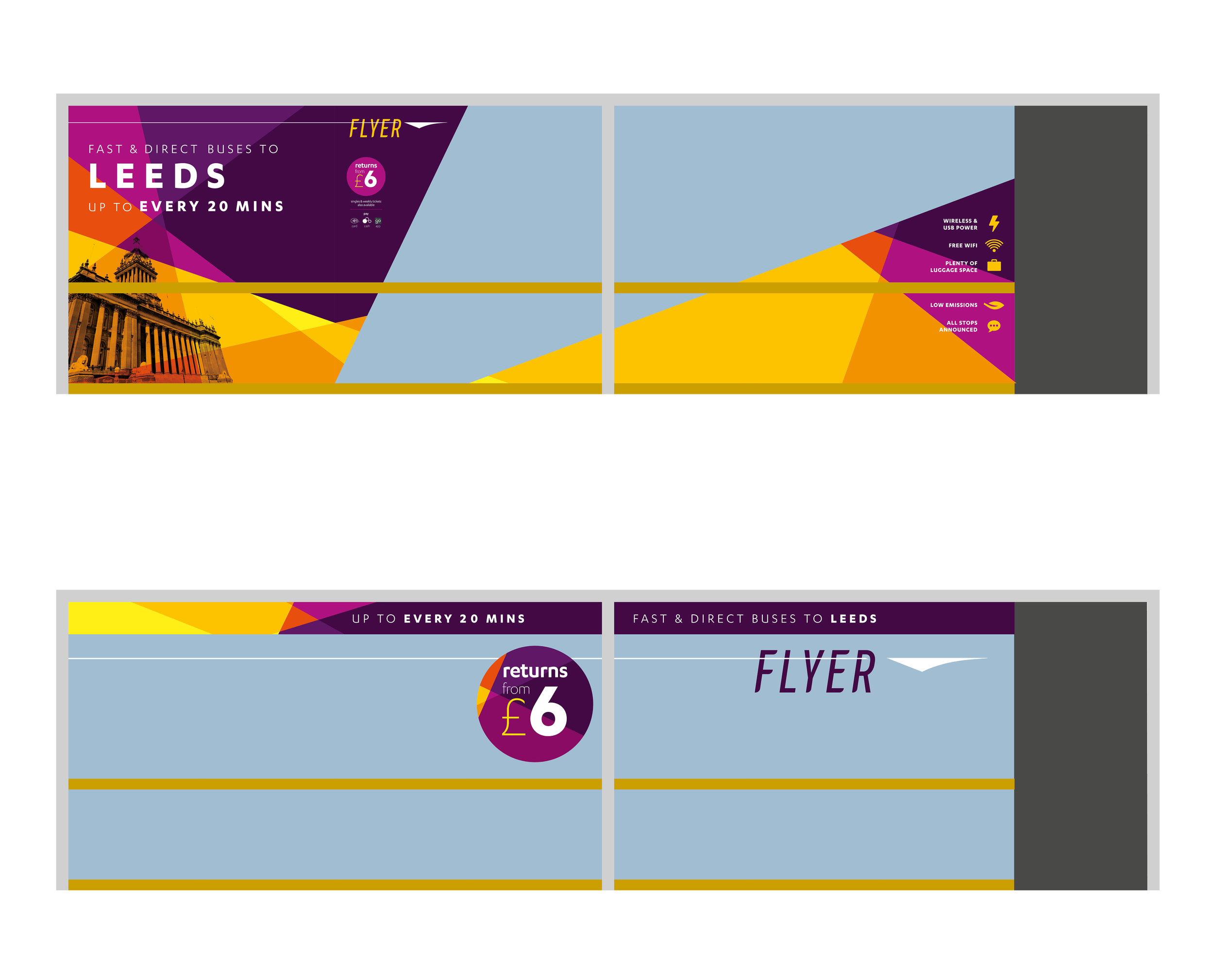 Too often there are various random buses at airport terminals. Do they go to the carpark, the city centre, or a small local town surrounded by sheep? Who knows! In this project I wanted every arriving passenger at Leeds Bradford airport to know about the airport bus, and everything required to use it, without any effort at all.