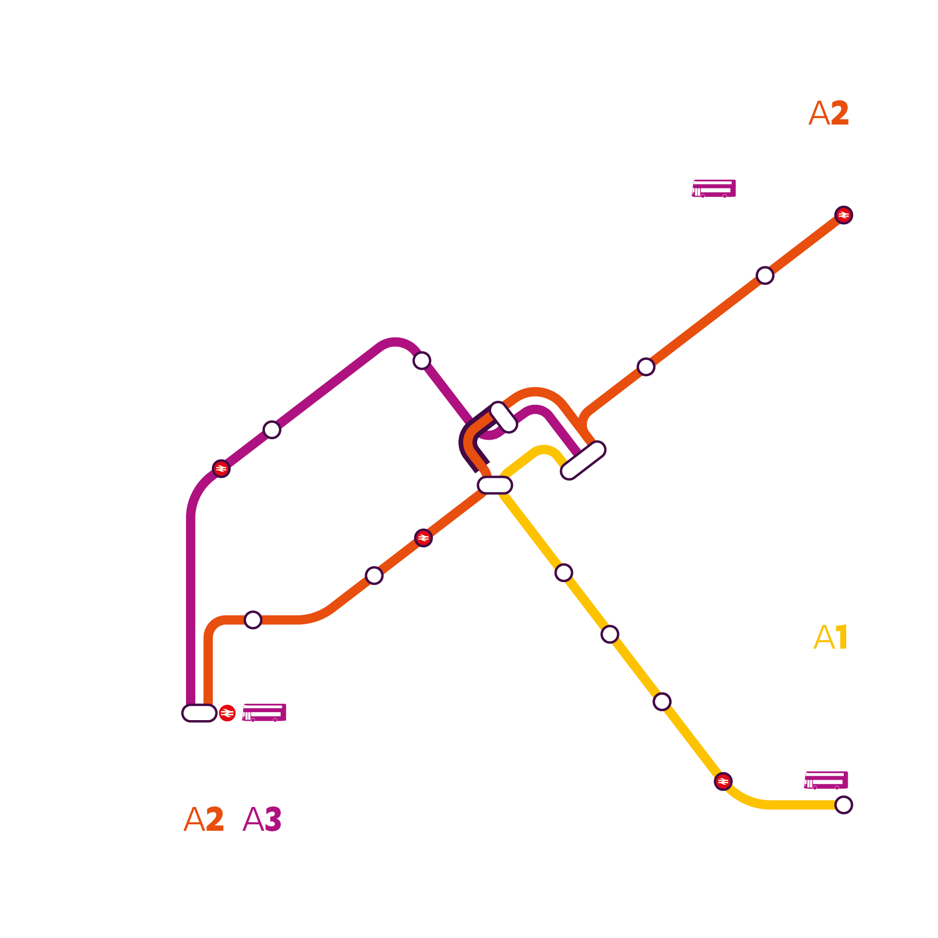 Branding consistency from station and terminal signage, to bus stops and livery (new and original)